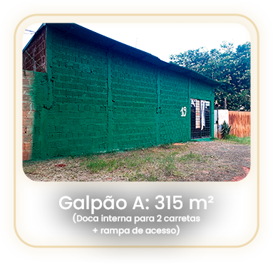 Galpão A: 1.205 m² (20x60x7) com doca interna para 2 carretas e rampa interna de acesso.