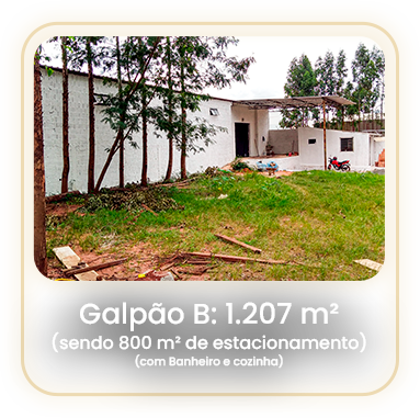 Galpão B: 312 m² (10x30x4) com banheiro e cozinha.