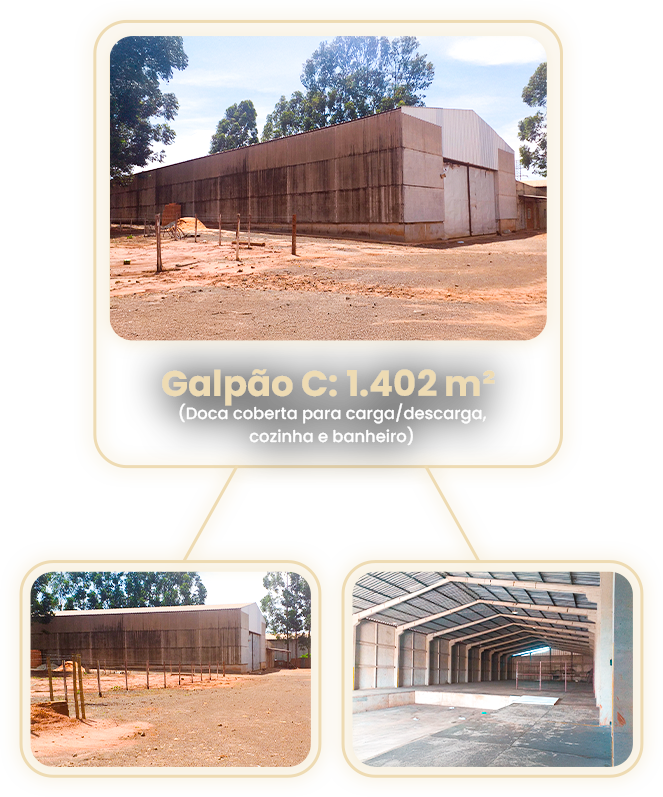 Galpão C: 403 m² (12x30x4) com doca coberta de carga e descarga, cozinha e banheiro.